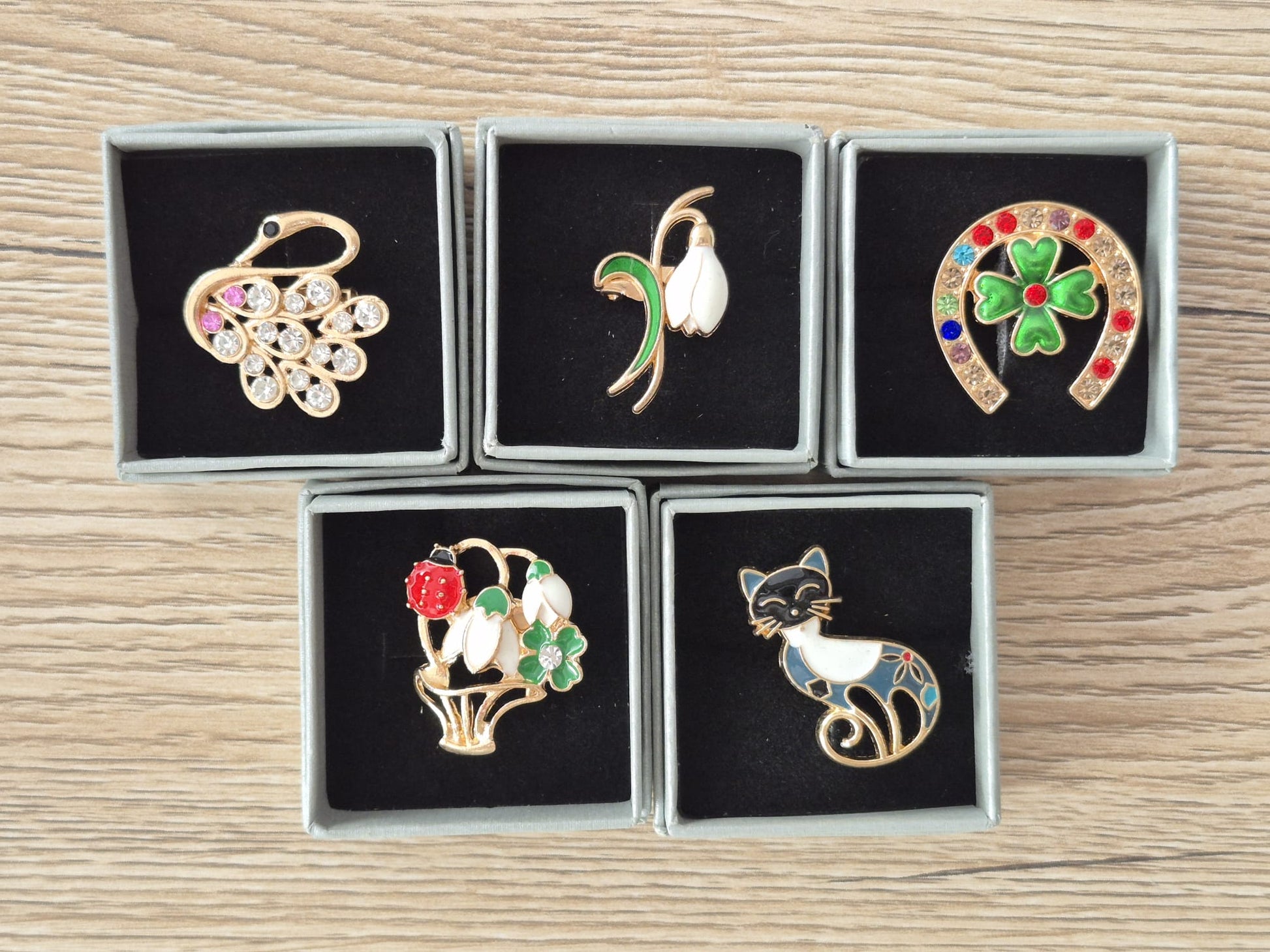Die Designs der Broschen sind unterschiedlich und variieren in Motiven, Formen und Dekorationen. Jede Brosche hat ihr individuelles Aussehen, was die Attraktivität erhöht und den Kunden die Wahl zwischen verschiedenen Varianten ermöglicht.