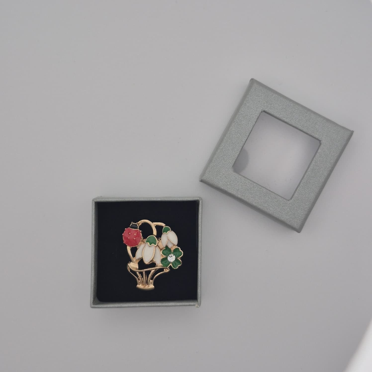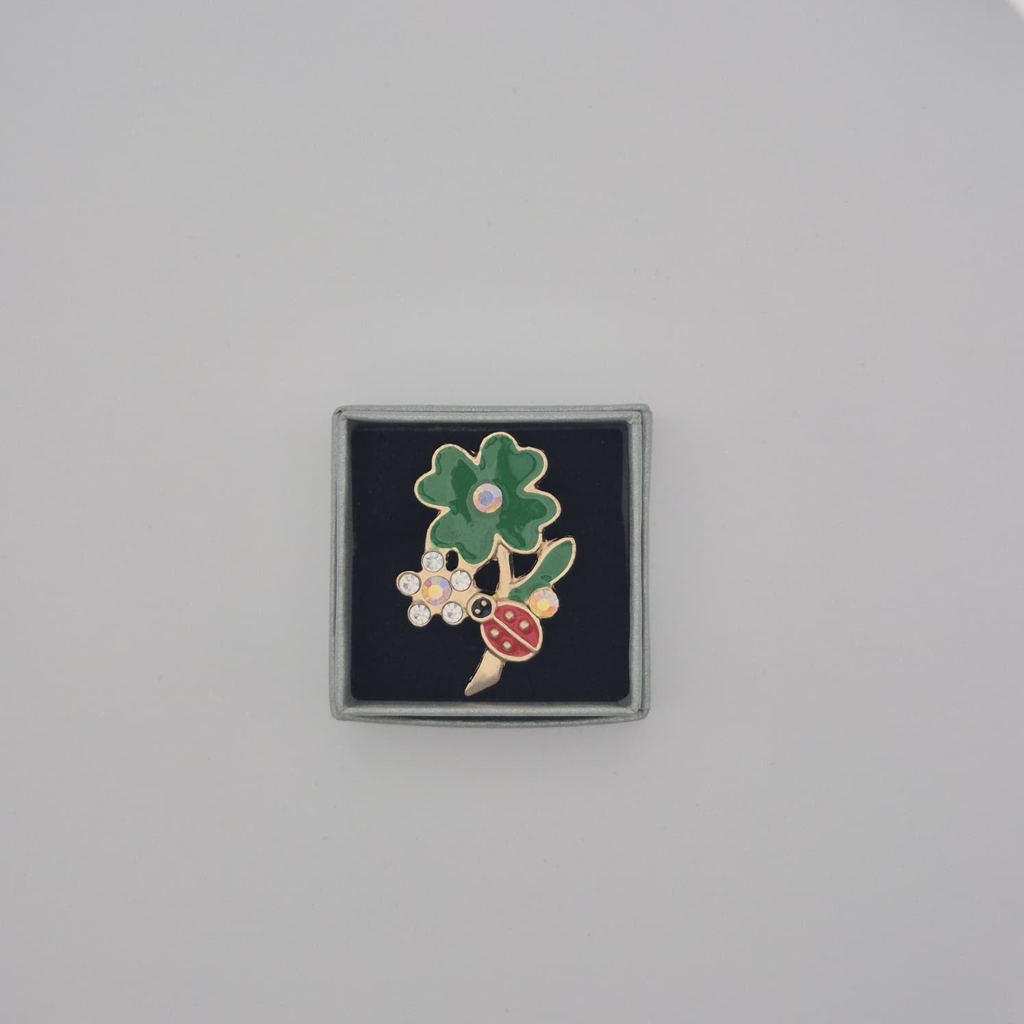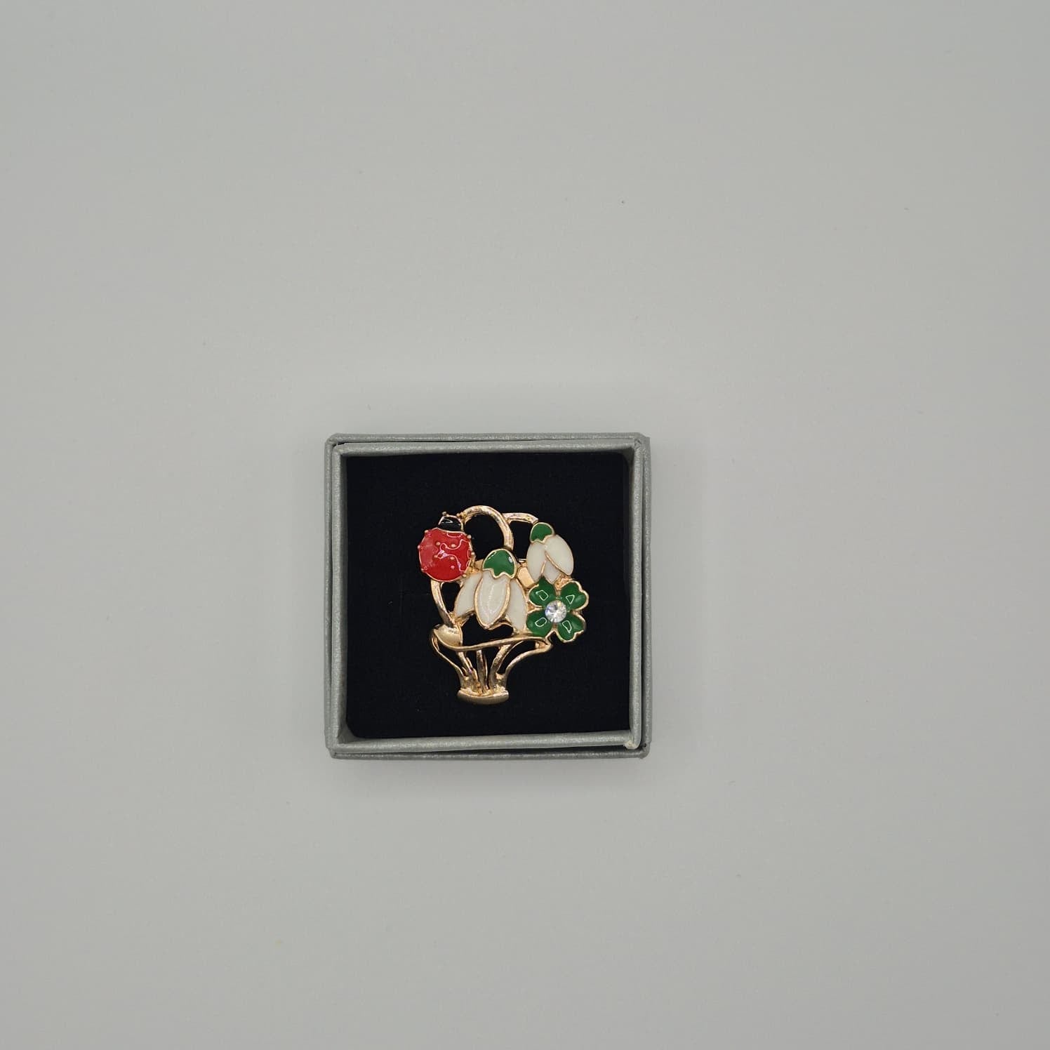 Die Brosche wird in einer kleinen Einzelbox mit ca. 4,5 cm Durchmesser geliefert. Die Verpackung schützt das Produkt zuverlässig und sorgt gleichzeitig für eine ordentliche, ansprechende Präsentation. Die Einzelverpackung ermöglicht eine direkte Platzierung auf Regalen, Verkaufsständen oder in Vitrinen und spart Zeit bei der Vorbereitung für den Verkauf.